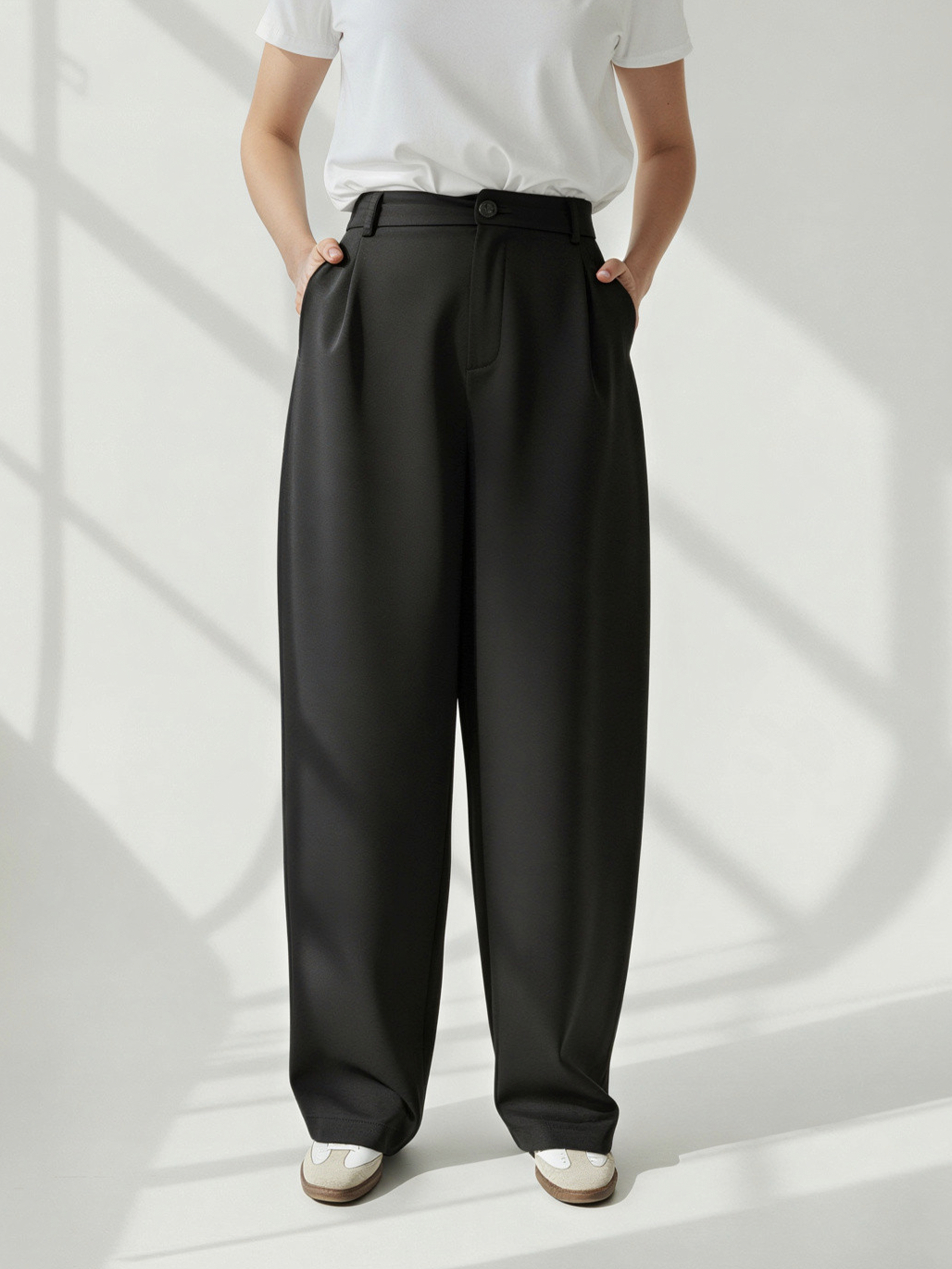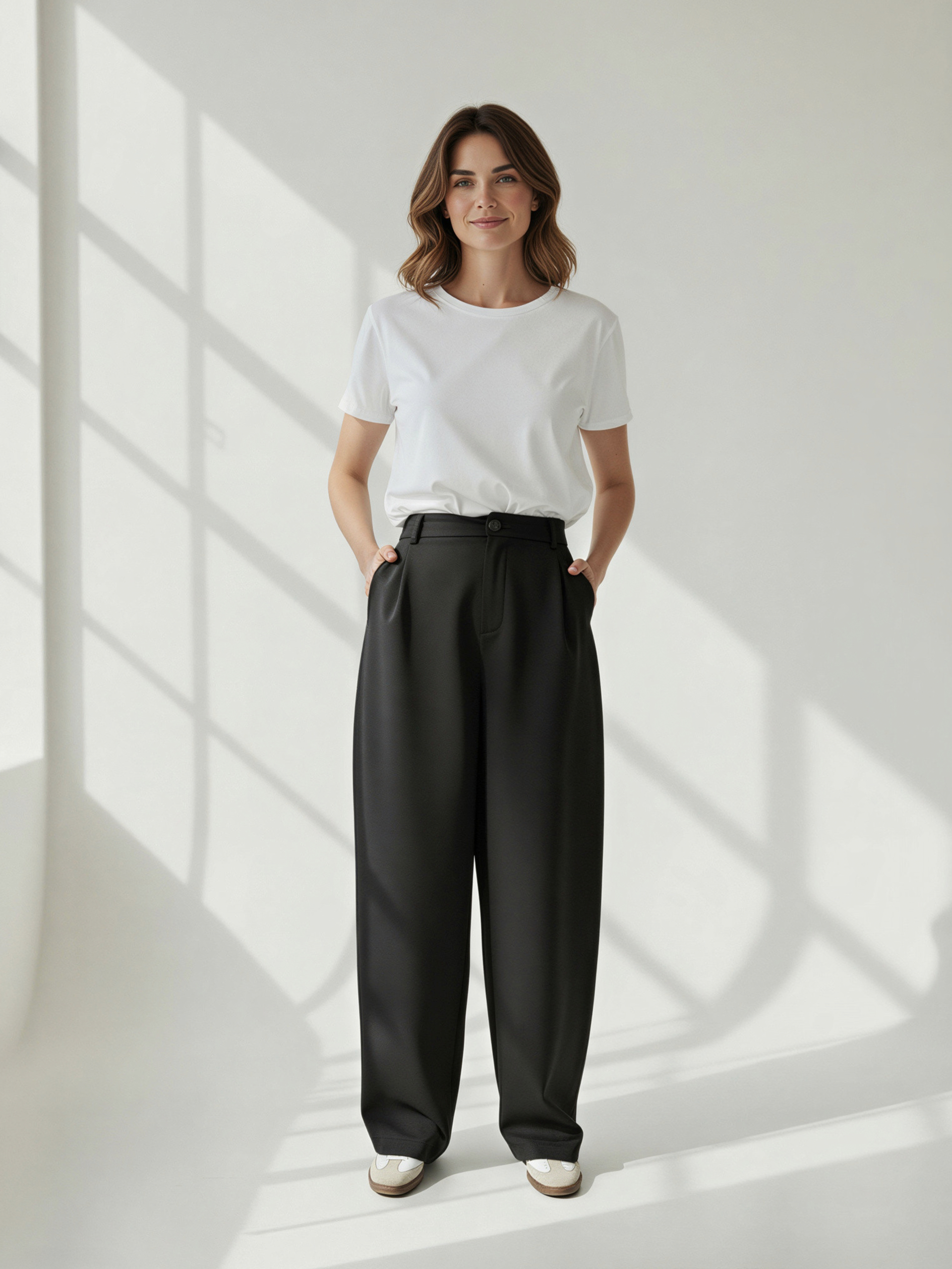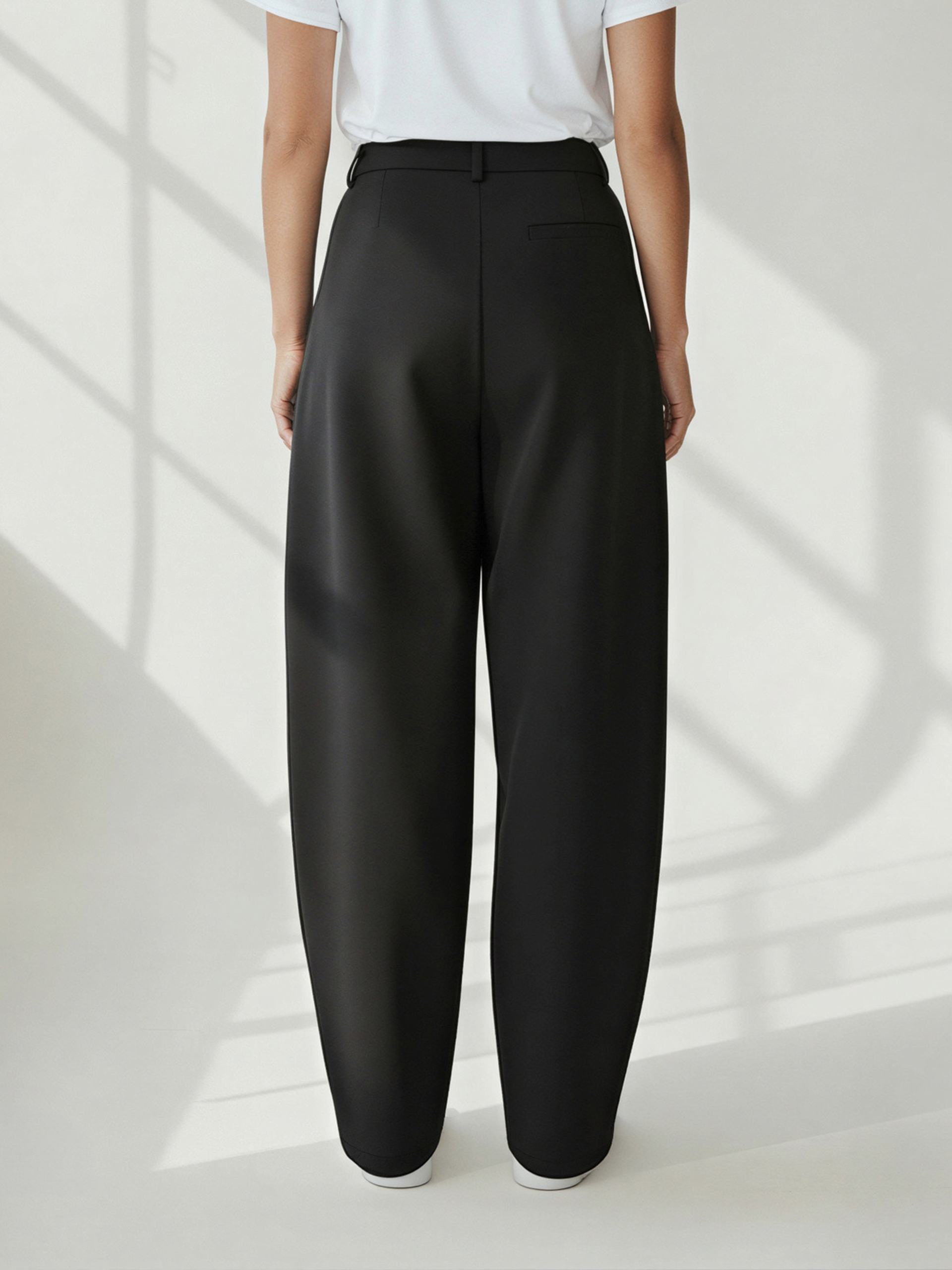 Eleganckie spodnie garniturowe w kroju balloon, które łączą minimalistyczną estetykę z codziennym komfortem noszenia.