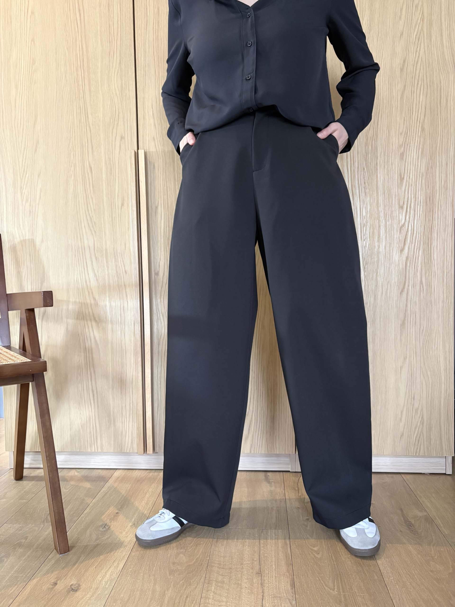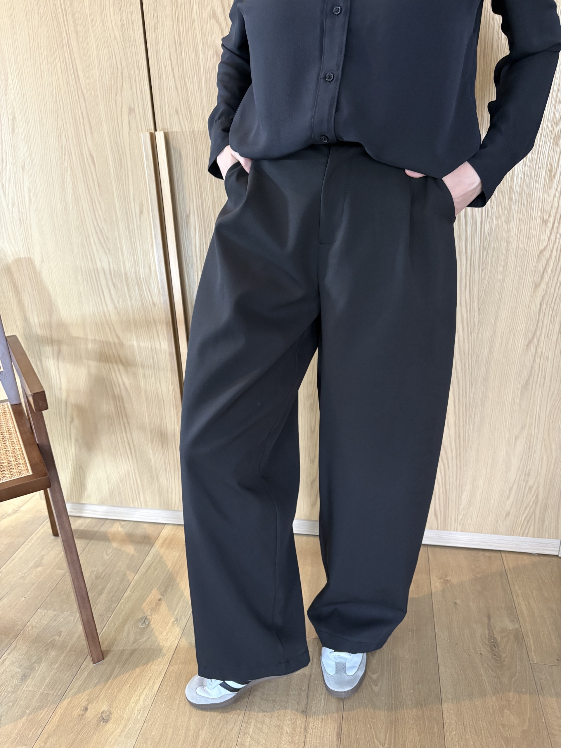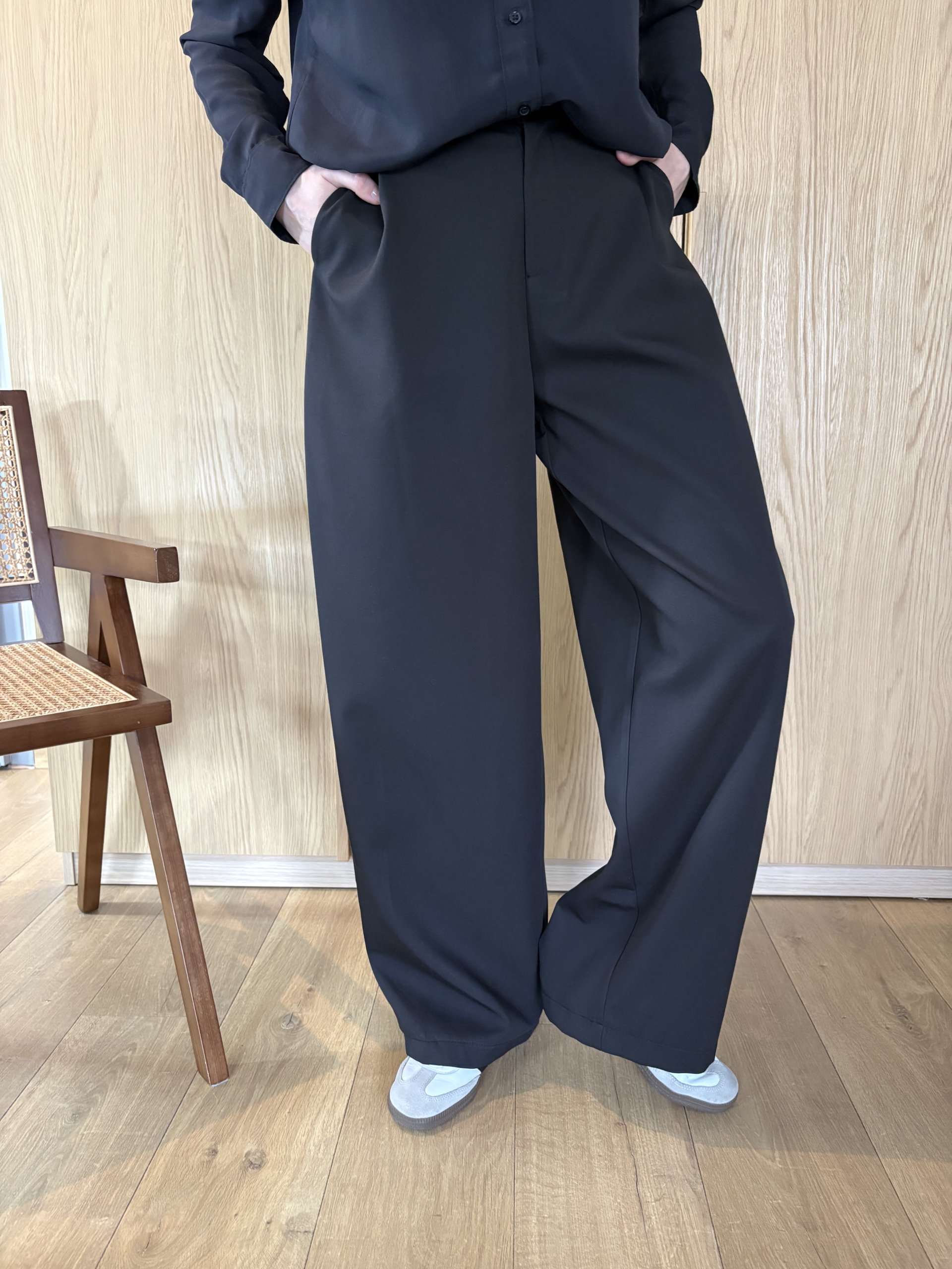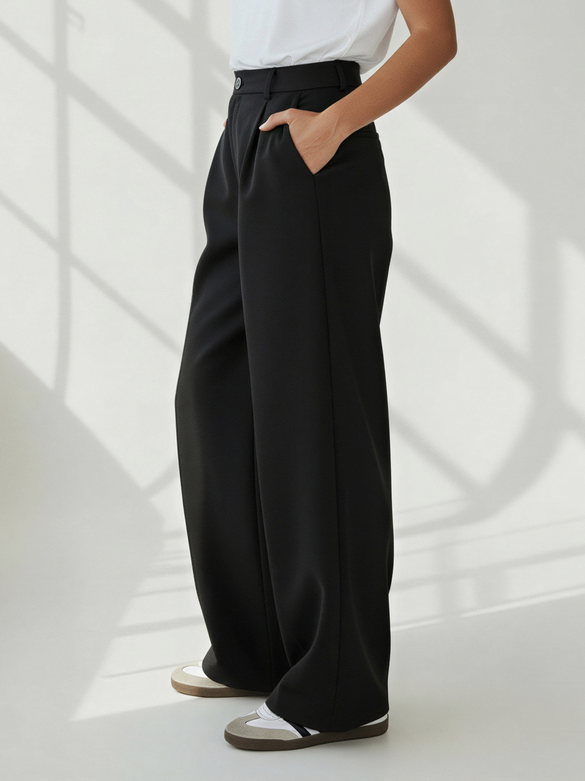 Eleganckie spodnie garniturowe w kroju balloon, które łączą minimalistyczną estetykę z codziennym komfortem noszenia.