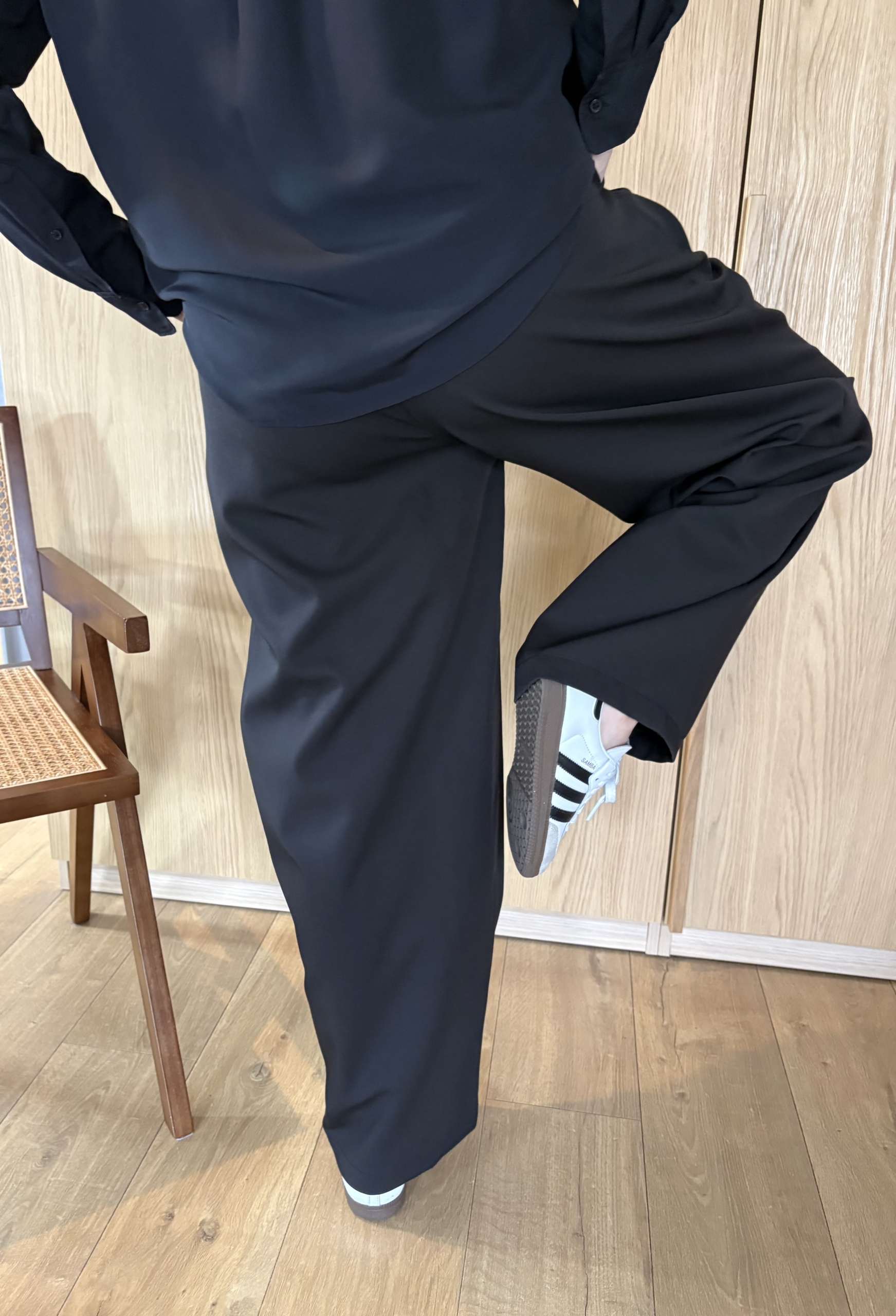 Model posiada wydłużoną, lekko zaokrągloną nogawkę, charakterystyczną dla fasonu balloon — swobodniejszą w górnej części i delikatnie zwężającą się ku dołowi. Dzięki temu spodnie zachowują elegancki charakter, a jednocześnie zapewniają komfort przez cały dzień.