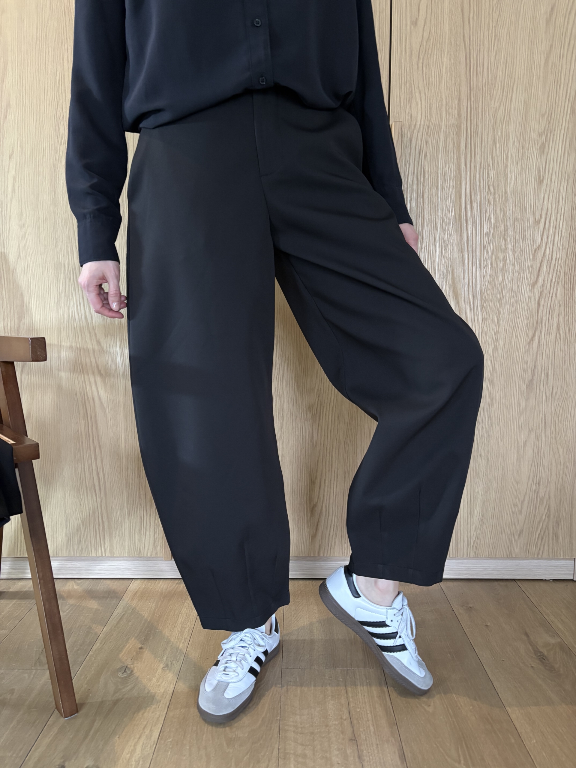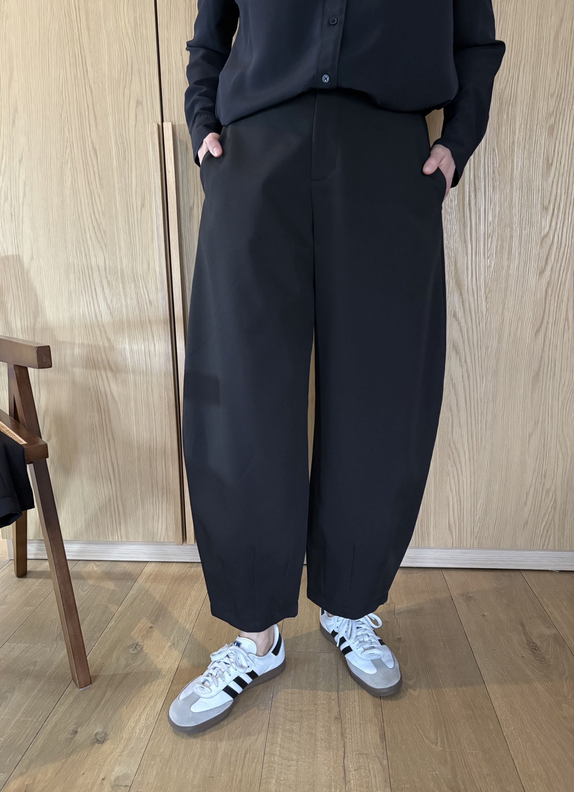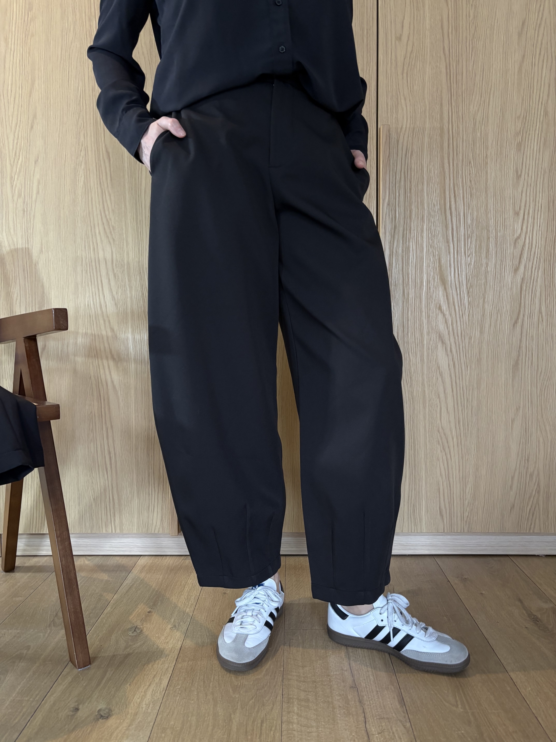 Charakterystycznym elementem modelu jest subtelny detal konstrukcyjny przy nogawkach, który podkreśla formę balloon i nadaje spodniom autorskiego charakteru.