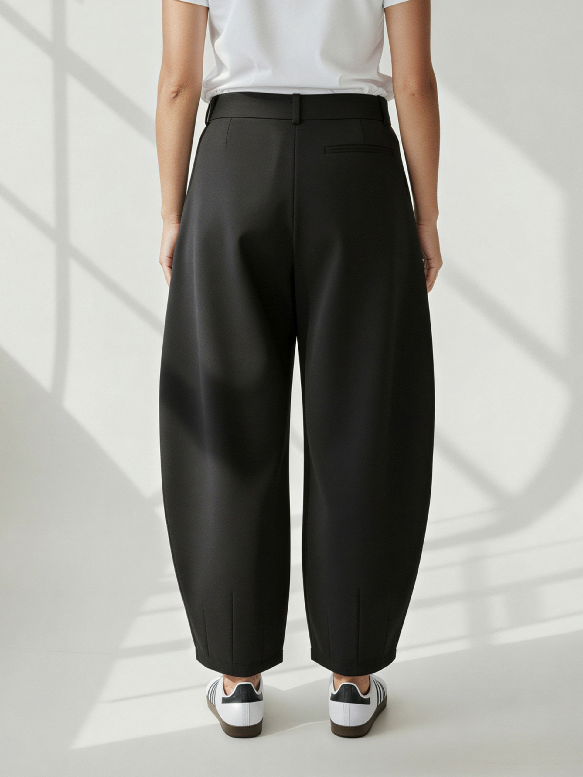 Spodnie FORM / Balloon to nowoczesny model o charakterystycznym fasonie balloon, uszyty z wysokiej jakości tkaniny garniturowej. Zaokrąglona linia nogawek i wysoki stan nadają sylwetce wyraziste proporcje, a subtelny detal przy nogawkach podkreśla ich unikalny charakter. Minimalizm, wygoda i ponadczasowy styl w jednej formie.