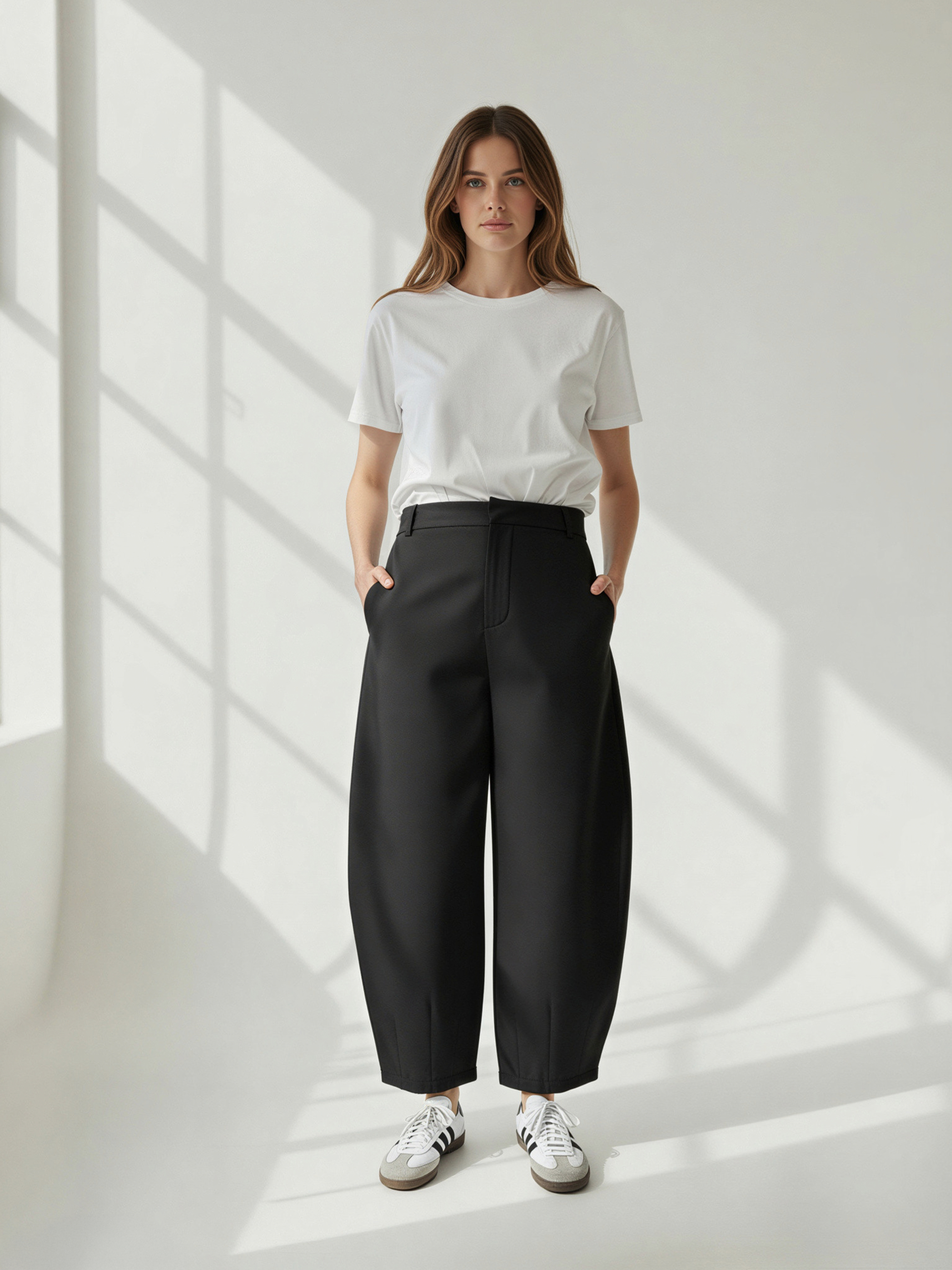 Fason typu balloon z lekko zaokrągloną nogawką nadaje sylwetce charakteru, jednocześnie zachowując swobodę i komfort noszenia. Wysoki stan podkreśla talię i subtelnie wydłuża proporcje.